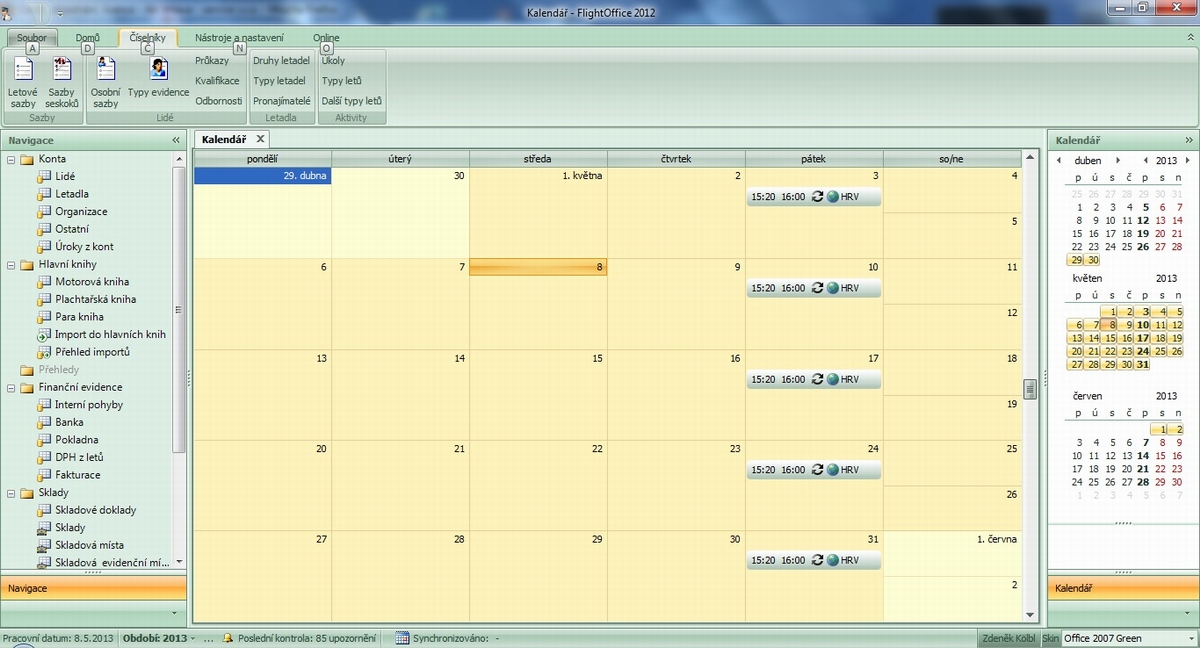 - podpůrnou evidenci - číselníky, letové sazby a ostatní potřebná nastavení.