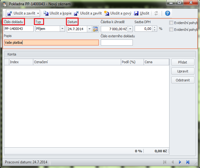 - datum - nabídne pracovní datum programu, v případě potřeby jej lze přepsat nebo vybrat z rozklikávacího kalendáře. Není možné jej smazat a nezadat (program nedovolí ponechat prázdné pole).