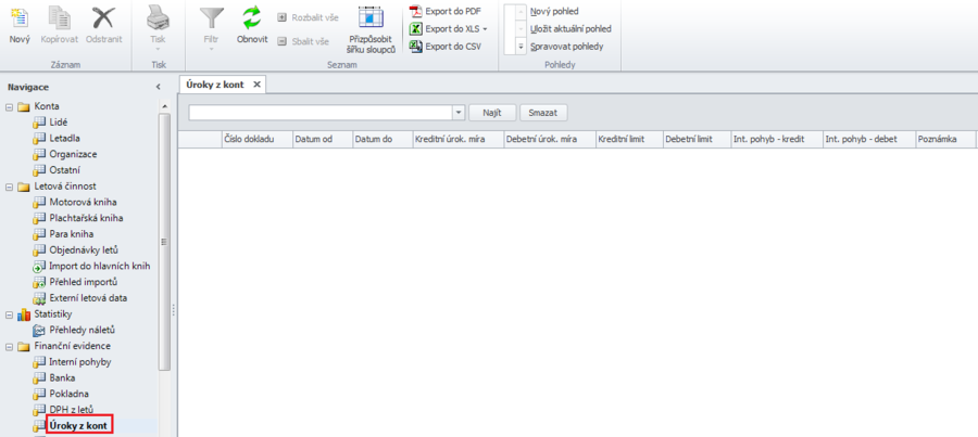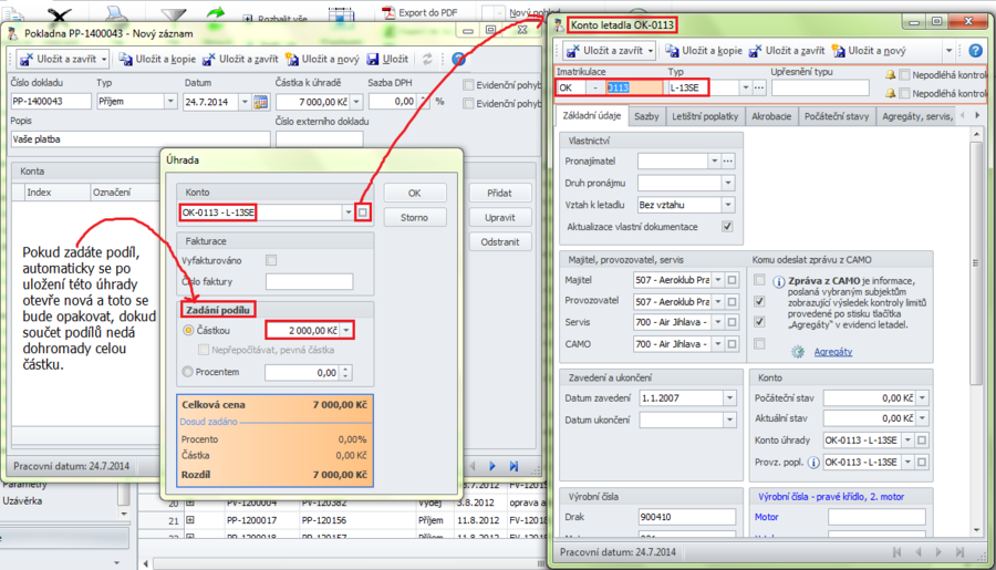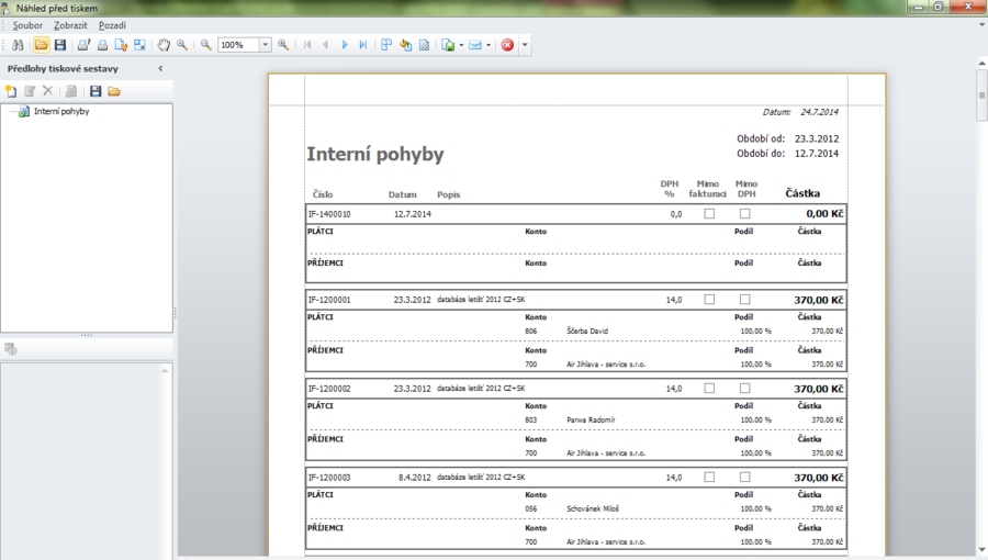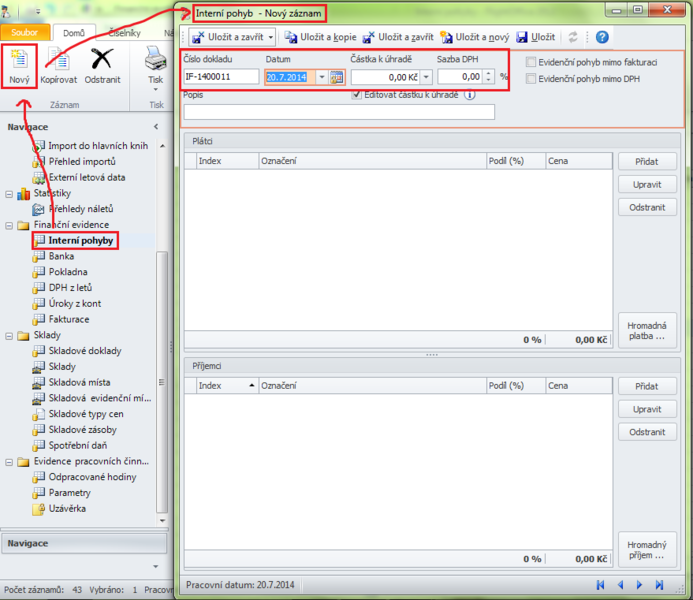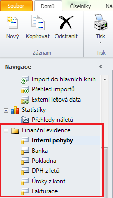 Interní pohyby - zadávání jednorázových finančních pohybů mezi kterýmikoliv konty programu (osob, letadel, ostatních) s vytvářením interních dokladů.