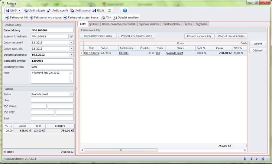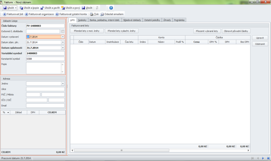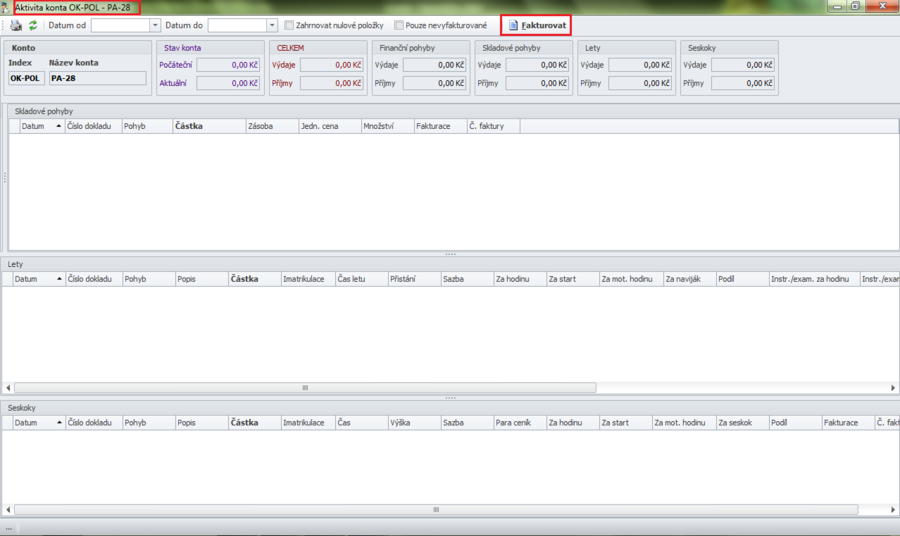 Fakturace - umožňuje vytváření faktur za zvolené doklady - lze přenést let/seskok z některé z hlavních knih, interní nebo skladový doklad atd. Tyto faktury mohou následně být velice přesnými podklady pro platby. Zvolením nabídky se otevře seznam vytvořených faktur. Při vytváření nové faktury se otevře okno obsahující: