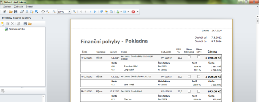 Pokladna - zde je možné ruční zadávání bankovních finančních pohybů (příjmů/výdajů) firmy na jednotlivá vnitřní konta s možností podle potřeby jednotlivé částky rozdělovat mezi konty. Také je možné importovat bankovní pohyby z účetního programu (nyní MONEY od firmy Cígler software, POHODA (od společnosti Stormware) a WinStrom FlexiBee (od společnosti FlexiBee Systems), postupně budou doplňovány další filtry) a rozdělit je na příslušná konta. V této části se zapisují hotovostní finanční převody.