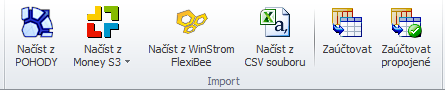 Import - funkce dostupná pro části "Banka" a "Pokladna". Jedná se o možnost importu z externích zdrojů, přesněji lze importovat bankovní pohyby z internetových účetních programů (nyní MONEY od firmy Cígler software, POHODA (od společnosti Stormware) a WinStrom FlexiBee (od společnosti FlexiBee Systems). Průběh je individuální, import zahájíte kliknutím na ikonu "Import" a následným kliknutím na ikonu vybraného softwaru. Export z Money je prováděn přímo bankovních nebo pokladních dokladů pomocí volby "XML přenosy - Export do XML - výběr nastavení pokladní doklady". Výhodou tohoto způsobu je, že se neexportuje kompletní databáze pokladních nebo bankovních dokladů a je možné např. pomocí filtru exportovat třeba jen vklady na konta.