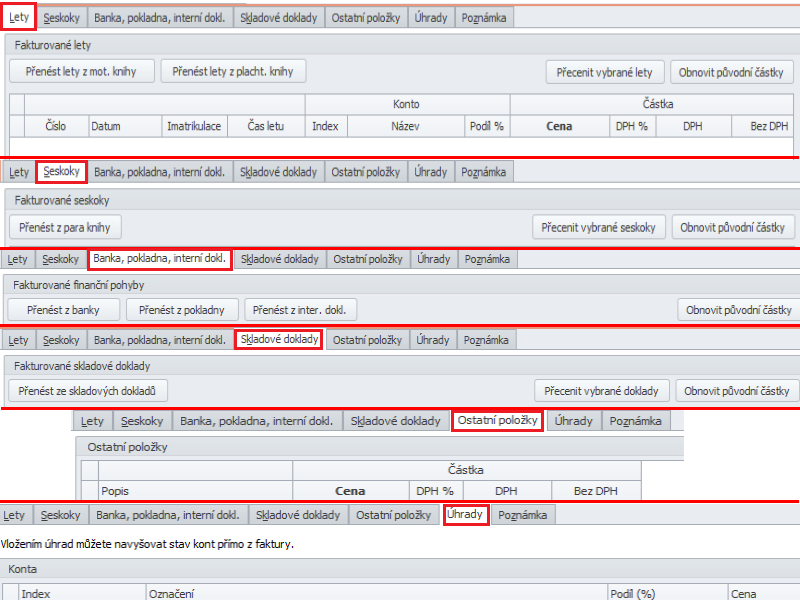 - Vytváření faktur z letů, seskoků, banky atd. Pomocí záložek pod horním panelem. Vyberte záložku, ze které chcete vybírat a klikněte na tlačítko "Přenést z *konkrétní kniha nebo databáze*". Otevře se okno, ve kterém můžete zvolit období, následně vybrat záznam a tlačítkem "Přenést" je přenést do faktury.