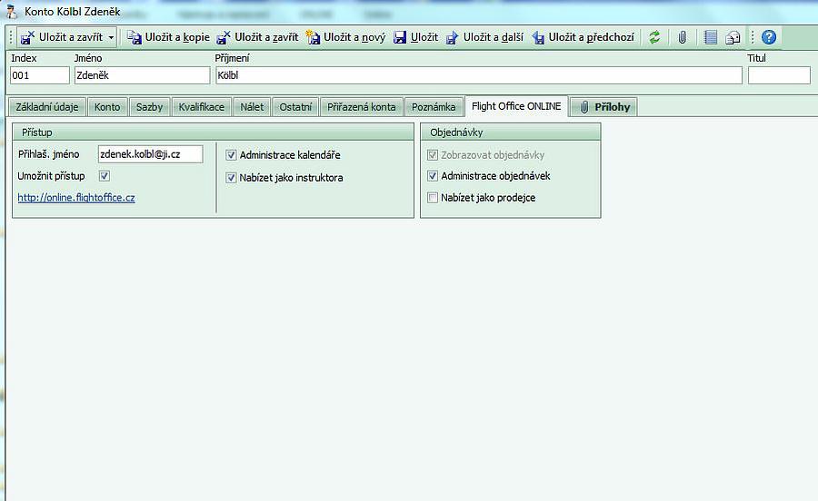 Na kartách lidí je v záložce "Flight Office online" uvedeno "Přihlašovací jméno", příznak "Umožnit přístup" a příznak "Administrace kalendáře". Přihlašovací jméno - e-mail - a příznaky mžete na kartě člověka vyplnit ručně nebo můžete použít funkci "Nastavení pro ONLINE".