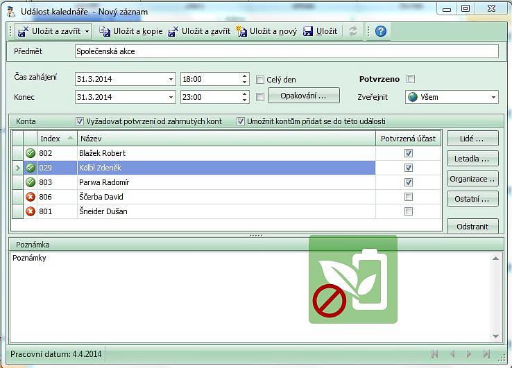 Lze do ní přidat účastníky události (pozvané účastníky), kteří mohou v ONLINE části potvrdit nebo zrušit svojí účast. V ONLINE části mohou přes internet zadávat tyto události lidé, kteří mají na své kartě na záložce "Konta - Lidé - Flight office online" zaškrtnutu funkci "Administrace kalendáře". Program v závislosti na nastavení v "Soubor - Nastavení - Kalendář" odesílá mailové zprávy účastníkům založených akcí.