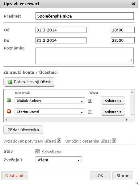 Zaškrtnutí příznaku "Umožnit přístup" znamená, že po odeslání dat na internet (viz níže) se dotyčnému vytvoří přístup k webové aplikaci a e-mailem obdrží přihlašovací údaje. Příznak "Administrace kalendáře" zůstane nezaškrtnutý.
