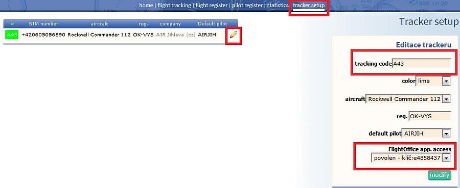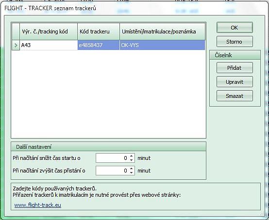 - na stránkách http://www.flight-track.eu/ si musí v nabídce "tracker setup" zjistit výrobní čísla svých zařízení, u každého povolit možnost komunikace a zjistit klíč, potřebný pro připojení