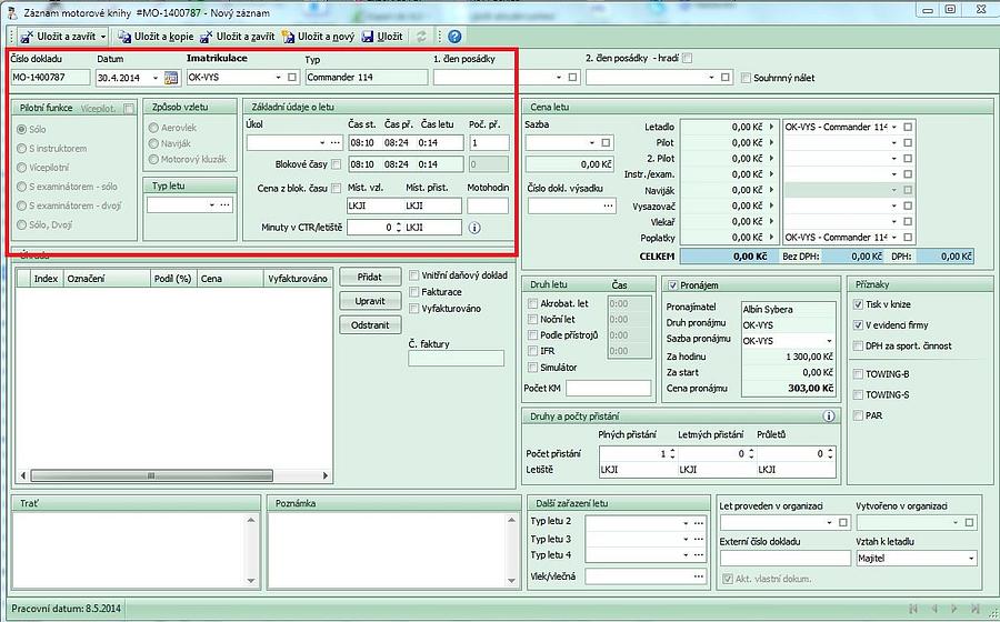 - sazba - nabídne se sazba, kterou má pilot na své osobní kartě. Můžete ji změnit, podle imatrikulace letadla se vloží výše sazby, spočítá se cena letu a vypočte se DPH.