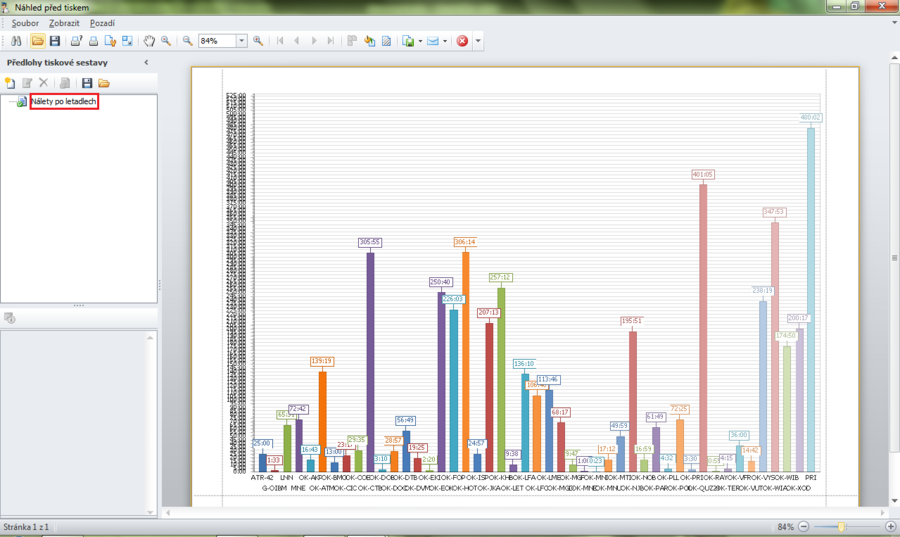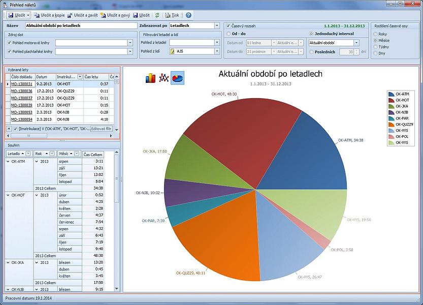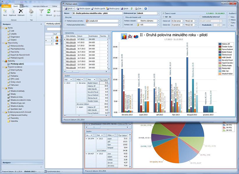 Na základě záznamů v hlavních knihách umí program vytvářet graf o činnosti pilotů a letadel v časových úsecích v podrobnostech, které určíte. Vytvořené grafy v konečné podobě lze tisknout.
