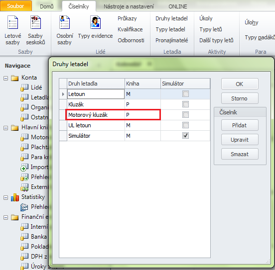"Číselníky - Druhy letadel" - zde jste při úvodní práci s programem a jeho nastavování vytvářeli základní druhy letadel (M=lety stroje jsou zapisovány do motorové knihy, P=lety stroje jsou zapisovány do plachtařské knihy):