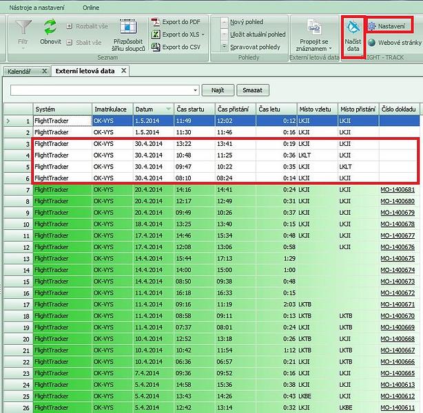 - poté je možné stisknutím tlačítka "Načíst data" spustit přenos do Flight Office.