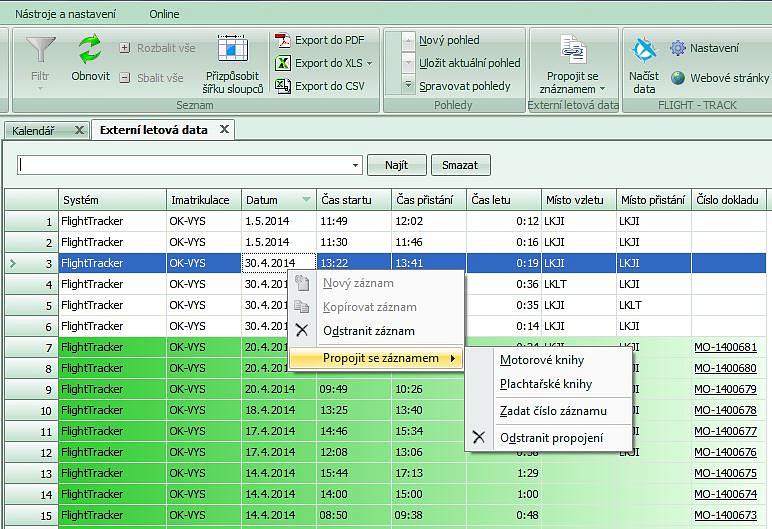 Poklepáním na řádek záznamu se otevře zápis do letové knihy, do kterého se přenesou stažené údaje. Po doplnění ostatních potřebných hodnot se let uloží do letové knihy, tím vznikne propojení mezi záznamy a řádek se barevně zvýrazní. Propojení je možné zrušit nebo je naopak možné stažený záznam propojit s již existujícím zápisem v letové knize.