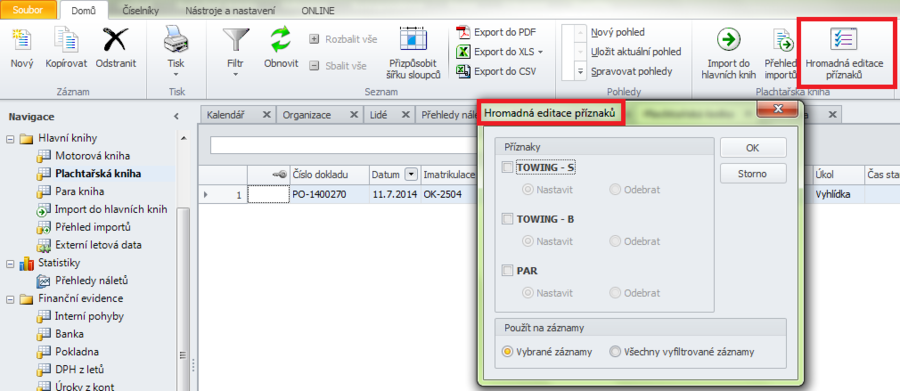 Na základě používání filtrovaní (viz. výše) je možné u plachtařské i motorové knih použití této volby, která umožňuje hromadně přidat nebo odebrat příznaky "TOWING - S", "TOWING - B" a PAR. Když si pomocí filtrů zvolíte v konkrétní knize lety, které chcete označit a kliknete na nabídku, otevře se vám možnost vybrat si, který příznak chcete na zvolené lety použít a zda jej chcete přidat nebo odebrat. Po uložení volby se všechny zvolené lety označí/odznačí vybraným příznakem.