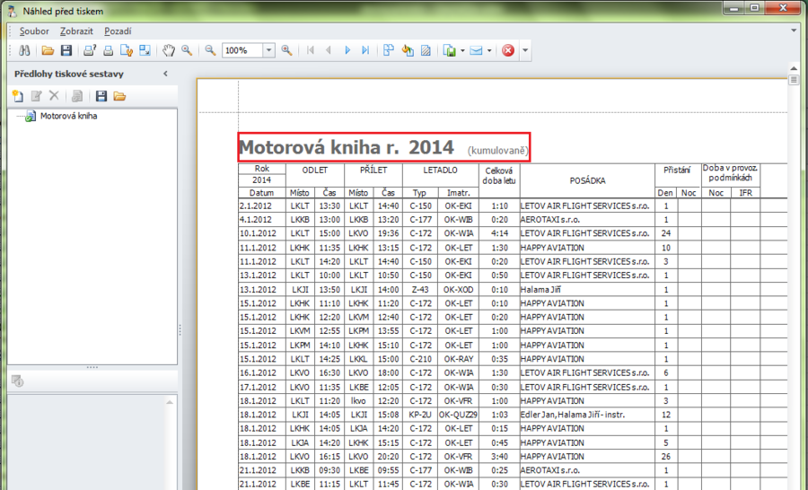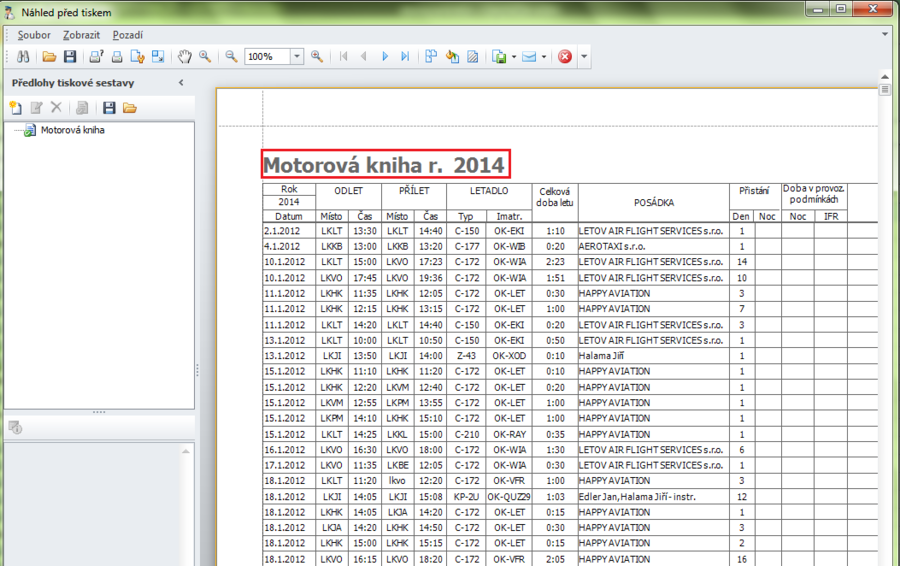 Z motorové a plachtařské knihy je možné tisknout pomocí volby: