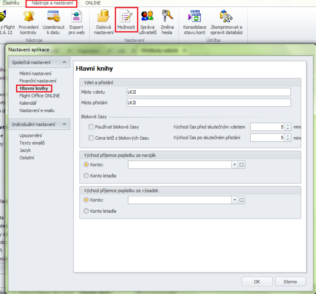 Nastavení hlavních knih (horní lišta - "Instalace, nastavení - Možnosti"):