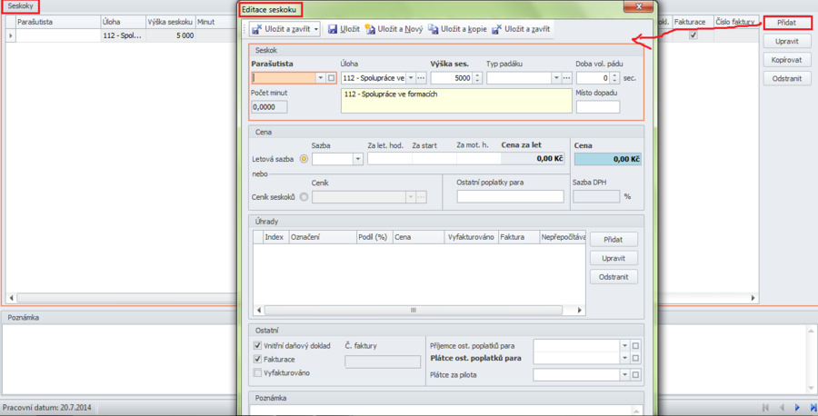 - cena - rozepsání ceny za seskok. Je možné zvolit použití Letové sazby (následně nabízí výběr ze sazeb používaných normálně pro ostatní letadla apod. Je možné vložit index přímo nebo ze seznamu tlačítek) nebo Ceníku seskoků (nabízí výběr ceníků seskoků přiřazených letadlu. Je možné vložit index nebo ze seznamu tlačítek. Nelze použít ceník, který není k použitému letadlu přiřazen.