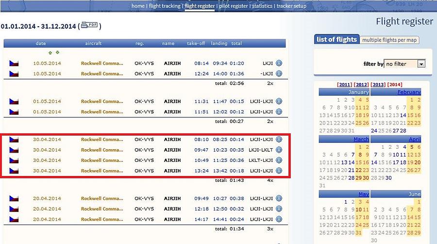 - sloupec "Čas celkem" - vedle dne letu zobrazuje jeho celkovou délku.