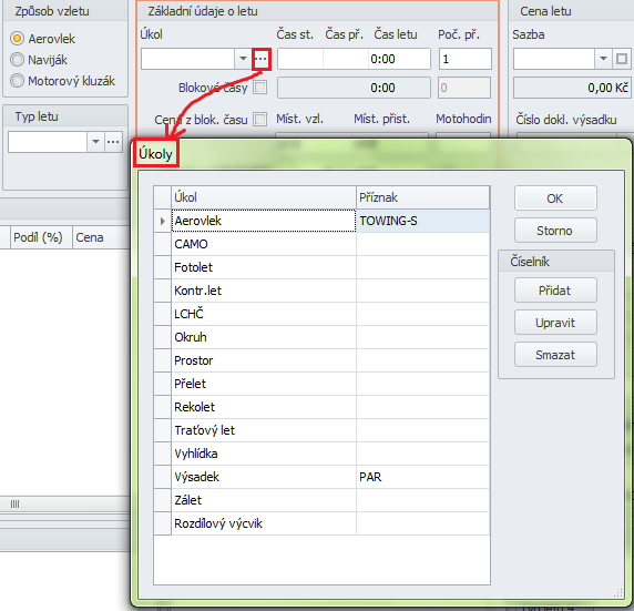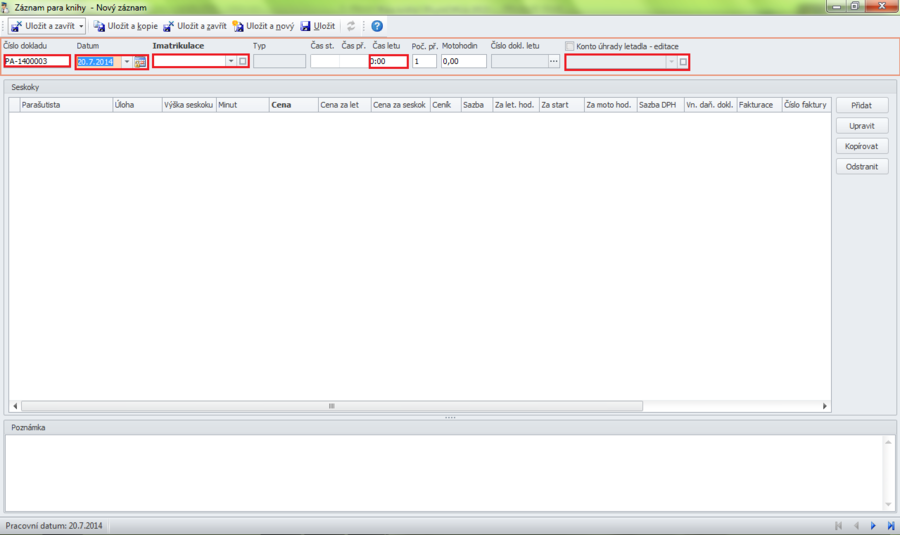 - číslo dokladu výsadku - pokud se jednalo a výsadkový let, je možné sem doplnit číslo dokladu konkrétního výsadku zadaného do para knihy ("Hlavní knihy - Para kniha"). Kliknutím na toto číslo a stisknutím klávesy Enter se otevře záznam zadaného výsadku.