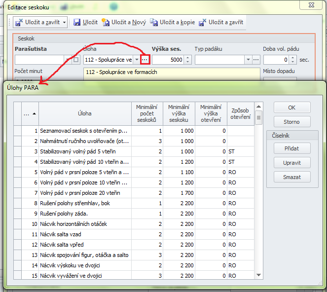 - seskoky - soupis seskoků provedených za letu. Tlačítka na pravé straně použijte k přidání, upravení, kopírování nebo odstranění seskoků. Při přidávání seskoku se otevře okno obsahující: