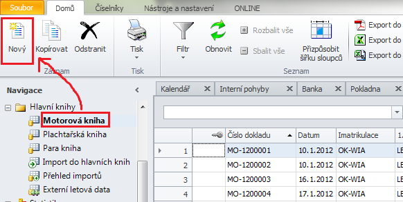 Kliknutím na ikonu "Nový" v "Hlavní knihy - Motorová kniha" otevřete zápis do motorové knihy - okno s informacemi k vyplnění.