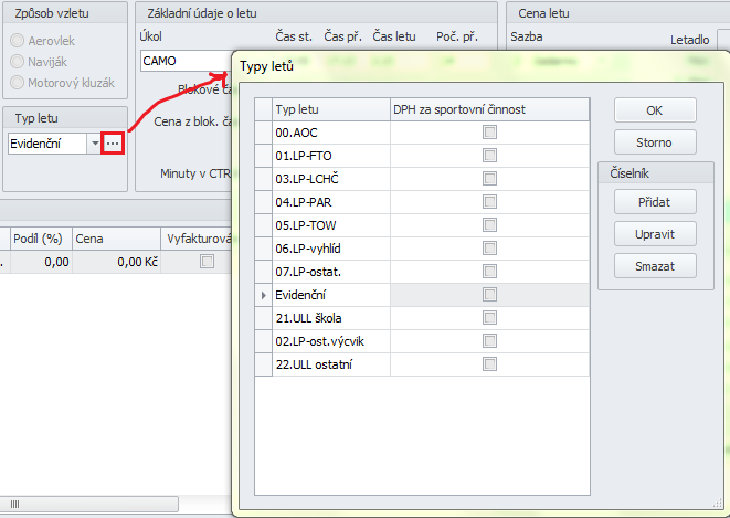 - příznak "DPH za sportovní činnost" - při zaškrtnutí bude do ceny letu započítaná snížená sazba DPH