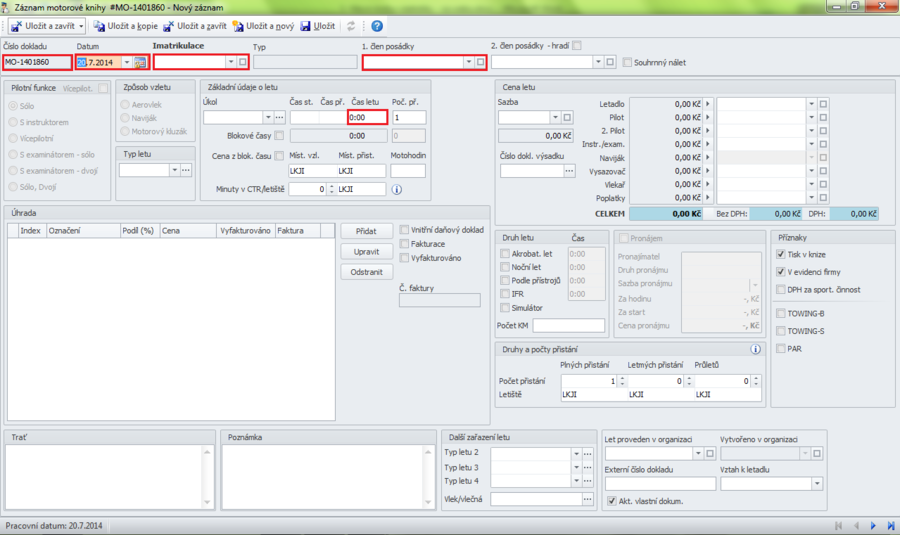- místo vzletu a přistání - pokud máte přednastaveno ve volbách, doplní se automaticky (asi je vhodné přednastavit si domovské letiště). Je možné přepsat.