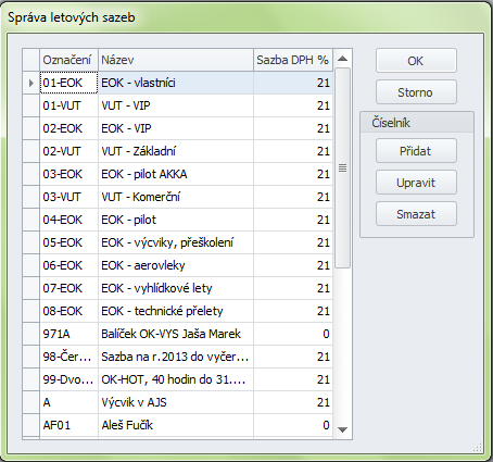 - sazba DPH - podle ní se bude při zadání konkrétní sazby vypočítávat cena letu bez DPH.