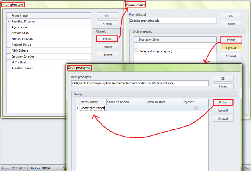 - pronajímatelé - seznam pronajímatelů provozovaných letadel, které lze přiřazovat k evidovaným strojům. Lze je libovolně v potřebném počtu přidávat, odstraňovat a měnit. Jedinou požadovanou a potřebnou informací je název.