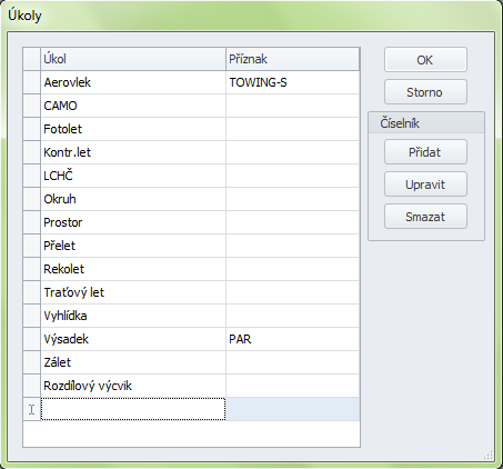 - příznak - slouží k jednoznačnému označení letů, které musí program vyhledat pro ověření kvalifikací s omezením práv navázaným na počet provedení určitých letů. Tento příznak se do záznamu doplní automaticky, pokud do seznamu úkolů přiřadíte k názvům úkolů příslušný příznak (např. k úkolům Aerovlek, Vlek z pole, Převlek apod. dáte příznak TOWING-S). Tím zajistíte jednotné označení příslušných letů tak, aby mohl program kontrolovat omezení práv kvalifikacím, kterých se to týká. Zatím byly vytvořeny příznaky "TOWING-S", TOWING-B" a "PAR". (příznak PAR zatím navíc pro účely dle uvážení uživatelů).
