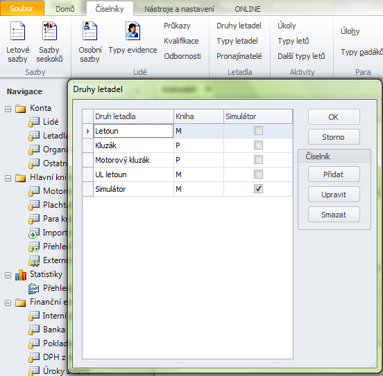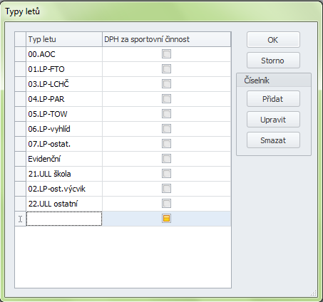 - typy letů - evidence typů letů, které lze v hlavních knihách doplňovat při zápisu letu.