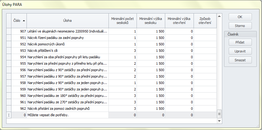 - minimální výška seskoku - vepište nebo zadejte pomocí šipek minimální výšku, ze které je možné provádět editovaný seskok. Při zadávání výšky seskoku program kontroluje, aby nebyla nižší, než tato minimální výška. Pokud se tak stane, zobrazí upozornění.
