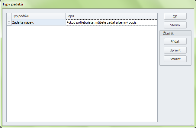 3. "Číselníky - Druhy letadel" - založte následující základní druhy letadel: