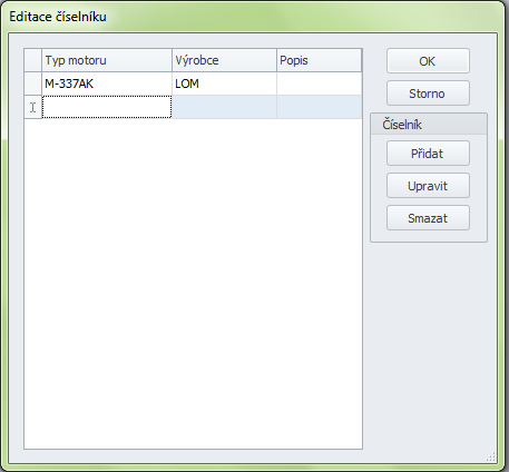 - typy motorů - umožňuje zadávat a upravovat typy motorů,
