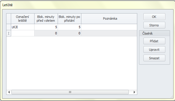 -další typy letů - seznam dalších typů letů, které lze přiřazovat letům při zápisu do hlavních knih. Jedná se o další nepovinné upřesnění letu. Lze je libovolně v potřebném počtu přidávat, odstraňovat a měnit. Jedinou požadovanou a potřebnou informací je název.