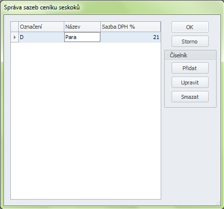 - sazby seskoků - správa sazeb seskoků, lze je libovolně přidávat, odstraňovat a upravovat.