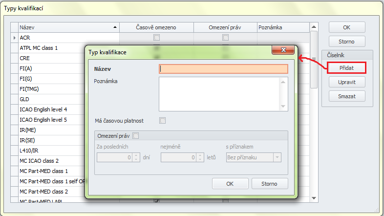 - příznak "Má časovou platnost"=Časově omezeno - pokud je tento příznak zaškrtnut, při přidávání kvalifikace k pilotovi bude vyžadováno datum konce platnosti (po tomto datu bude kvalifikace hlášena jako neplatná, pokud se nezadá, bude programem také považována za neplatnou).