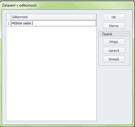 Na obrázcích doprovázejících nápovědu je vždy znázorněné zadávání nového číselníku v případě, že se zadává přes nové okno. Pokud tedy není na obrázku uvedeno něco jiného, znamená to, že tlačítko přidat pouze zpřístupní pole v již otevřeném okně správy číselníků.