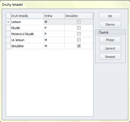 - kniha - vyberte z nabídky, do které knihy má být druh letadla zařazován (M=motorová, P=plachtařská).