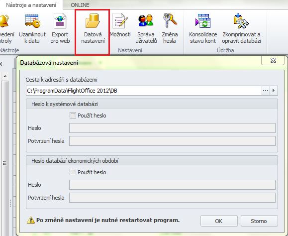 - datová nastavení - je možné vybrat, do kterého adresáře (a na který počítač) se budou ukládat databáze a také tento adresář zaheslovat.