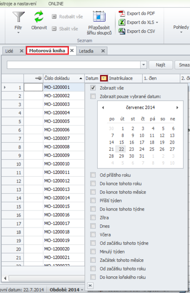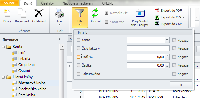 Filtry - dostupné pro konta lidí a letadel, motorovou a plachtařskou knihu a interní pohyby, banku, pokladnu.