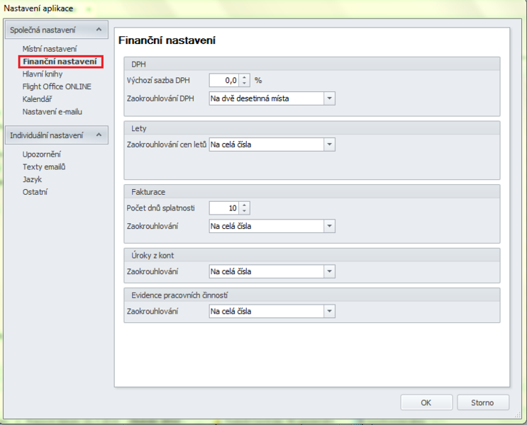 - finanční nastavení - vyplňte údaje podle potřeby. Umožňuje mimo jiné zvolení způsobu zaokrouhlování cen letů a DPH (celá čísla, dvě desetinná místa atd.). Více informací v nápovědě Finanční evidence