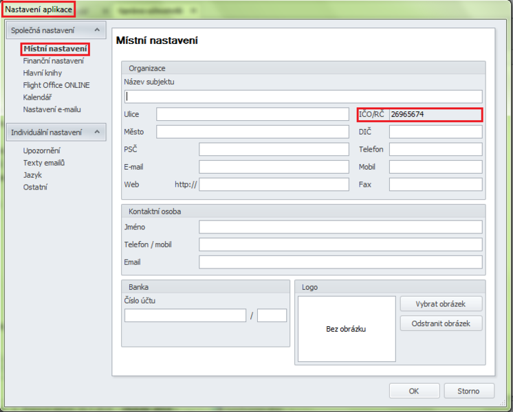 - místní nastavení - vyplňte podle potřeby minimálně IČO/RČ. Pokud provozujete i FO ONLINE, povinným údajem je také email.