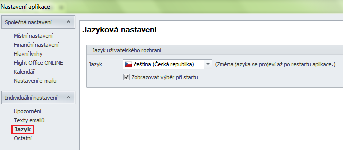 Program spustíte pomocí ikony Flight Office GA, která se vytvoří na ploše. Při spuštění požaduje program heslo základního uživatele (admin), které je nastaveno na "1234". Toto heslo a parametry uživatele admin si následně můžete změnit v záložce "Soubor - Nastavení - Uživatelé". Při každém spouštění programu se také objevuje volba jazyka programu - angličtina nebo čeština. V "Soubor - Nastavení - Jazyk" je možné nastavit jazyk a po zrušení zaškrtnutí příznaku "Zobrazovat volbu při startu" se program na jazyk ptát nebude (v Možnostech bude vždy možné jej změnit).
