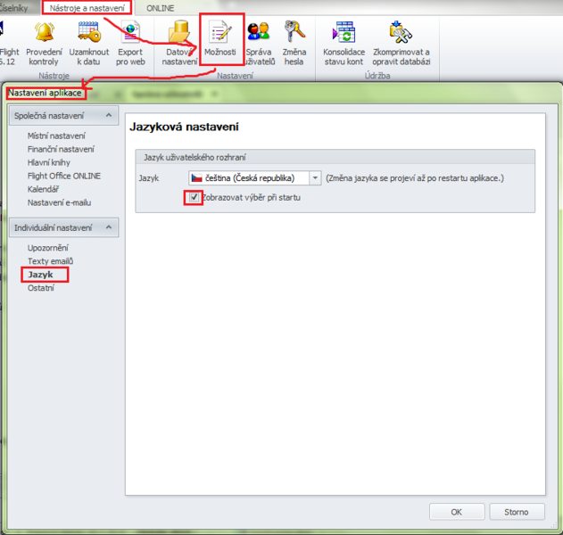 - jazyk - volba jazyka (Angličtina/Čeština). Po zaškrtnutí příznaku "Zobrazovat výběr při startu" se bude program na jazyk ptát při každém zapínání.