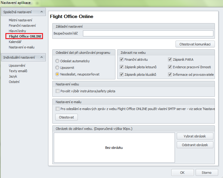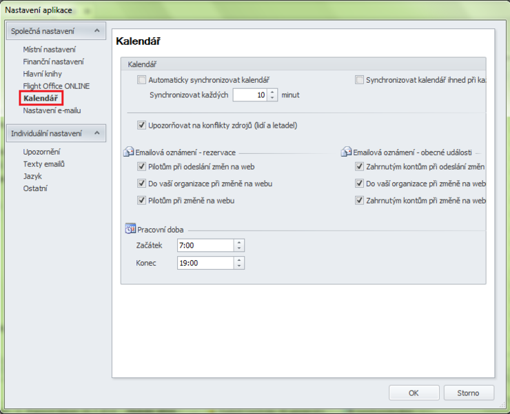 - Flight Office ONLINE - nastavení pro ONLINE. Více informací o konkrétních položkách najdete v nápovědě Kalendář a ONLINE.