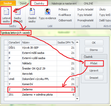 2. "Číselníky - Letové sazby" - založte alespoň jednu sazbu, doporučujeme např. sazbu "Z" název "Zadarmo". Více informací níže v této nápovědě - Číselníky.