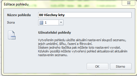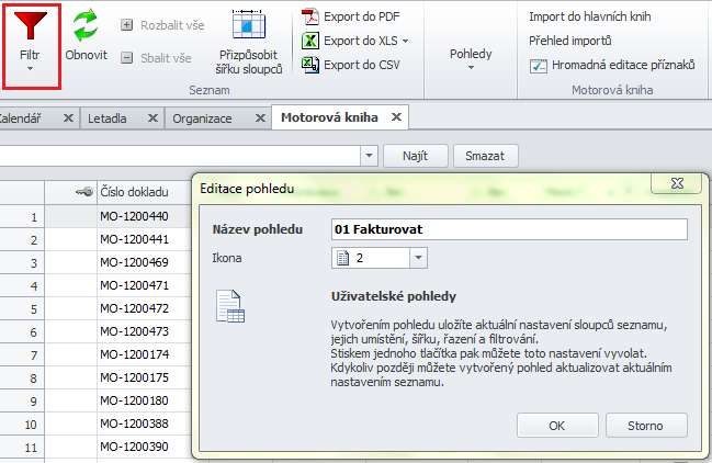 Do horního panelu nástrojů všech základních nabídek bylo doplněno pole "Pohledy". Pohledem je nazvána možnost uložit pod zvoleným názvem použité nastavení filtru (pokud je v dané nabídce v provozu), počtu a pořadí sloupců a nastavení filtrů jednotlivých sloupců.