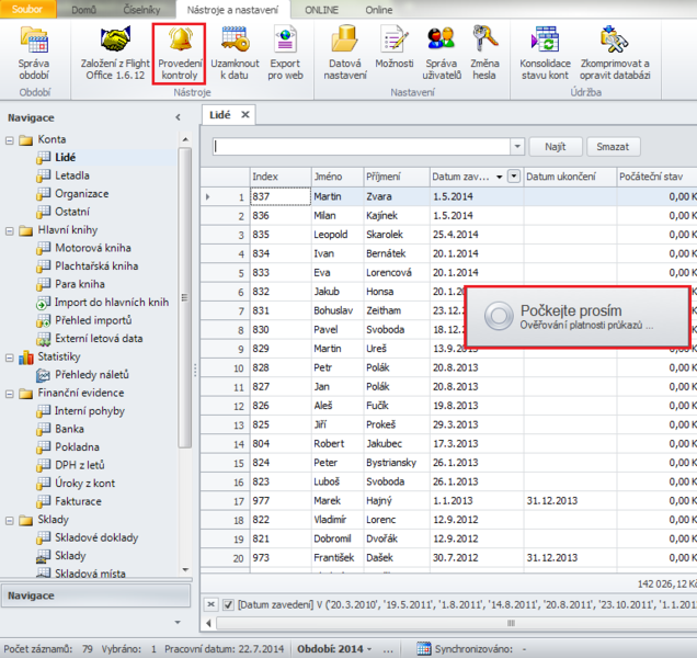 - provedení kontroly - program provede kontrolu platnosti pilotních průkazů, kvalifikací, stavů kont a limitů letadel a ukáže seznam propadlých kvalifikací apod. s datem, kdy skončila jejich platnost. Výsledek kontroly lze odeslat emailem. Před odesláním zprávy je možné vyfiltrovat, které záznamy chcete odeslat (např. pouze kvalifikace jednoho člověka). Také lze výsledek vytisknout.