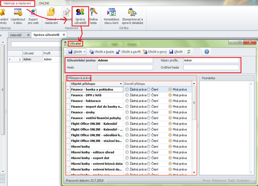 - správa uživatelů - můžete nastavit více uživatelů a detailně spravovat jejich přístup k editaci různých částí programu, a to od pouhé možnosti prohlédnout si stav vlastního konta přes možnost zápisu letů až po kompletní práva administrátora.
