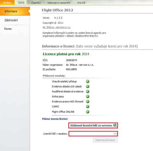 Po instalaci je program v DEMO režimu (počet záznamů je omezen na 30, některé zvlášť placené funkce nejsou v provozu). Licenci můžete objednat přímo z programu. Zvolte záložku "Soubor - Informace", stiskněte "Objednat licenci", vyplňte požadované údaje a vyberte části programu, které chcete objednat. Objednávku můžete rovnou odeslat mailem nebo objednávkový soubor uložte a následně pošlete mailem (na flightoffice@airjihlava.cz). Na základě vaší objednávky vám bude vystavena faktura dle ceníku a po její úhradě vám bude vygenerována licence, která bude dostupná pro online aktivaci licenčních klíčů na jednotlivých počítačích.